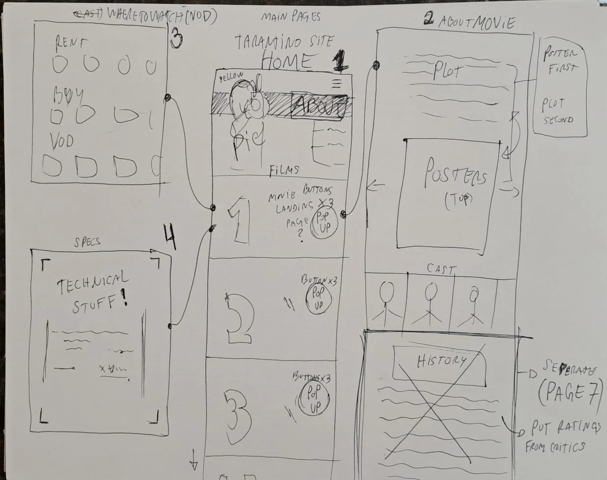 When you click a movie, a card pop up is revealed. It contains buttons to all the pages for that film. I did the Pulp Fiction one, but the idea is the same for all others as well.